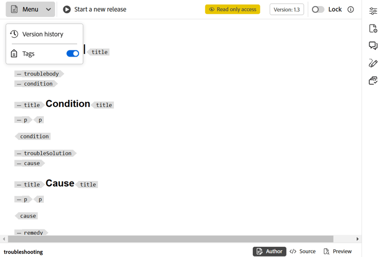 一旦檔案成功標示為已核准,檔案的 預覽 就會以唯讀模式顯示。 所有編輯選項都會從所有三種模式(作者、Source和預覽)中移除。 不過,您仍可存取功能表為 版本歷程記錄 與 標籤 選項的 功能表 下拉式清單。