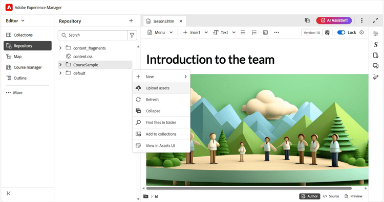 如果您偏好使用您系統中的H5P內容,請先在DAM中使用上傳資產 選項 上傳檔案,然後將其加入存放庫檢視/Assets。