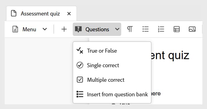 從工具列的 問題 下拉式選單中選擇所需的問題型別。 您可以根據您的需求,使用下列三種可用格式中的任何一種來新增問題:真或假、單一正確和多重正確,如下所示。