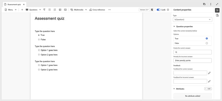 您可以選取任何問題,並使用 內容屬性 面板來設定其屬性。 例如,您可以指定正確答案、設定要授與的標籤,以及定義不正確回應的任何懲罰。