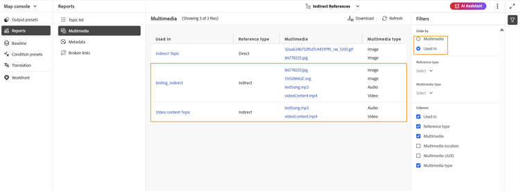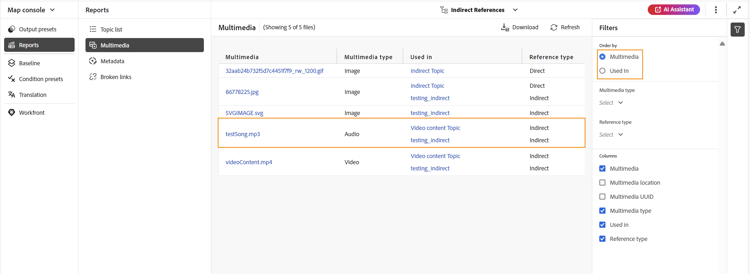 如果您依 用於 欄排序,您將檢視已使用多媒體的參照名稱列在第一欄,而多媒體名稱則列在另一欄的不同列。 例如,下列熒幕擷圖顯示第一欄中兩個參照\(testing_indirect和Video content Topic\)的名稱,而多媒體testSong.mp3則顯示在第三欄的兩個獨立列中。