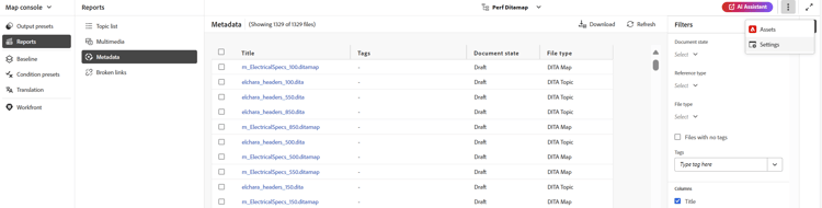 Adobe Experience Manager Guides在Map Console中提供的功能可讓您檢查地圖的整體完整性,並為其產生報表。