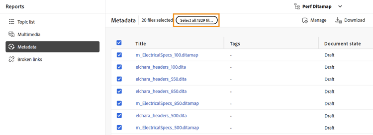 中繼資料報表提供您目前DITA map中參考的詳細報表,例如參考型別、檔案狀態、標籤、檔案位置等。
