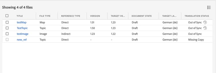 Experience Manager Guides提供的功能可檢查主題的所選版本與上次翻譯來源版本之間的差異。 您可以選擇根據所做的變更來翻譯 不同步 檔案。