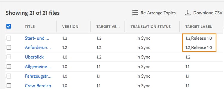 Experience Manager Guides可讓您將來源檔案的標籤傳遞至目標檔案。 這可協助您輕鬆識別翻譯檔案的來源版本。