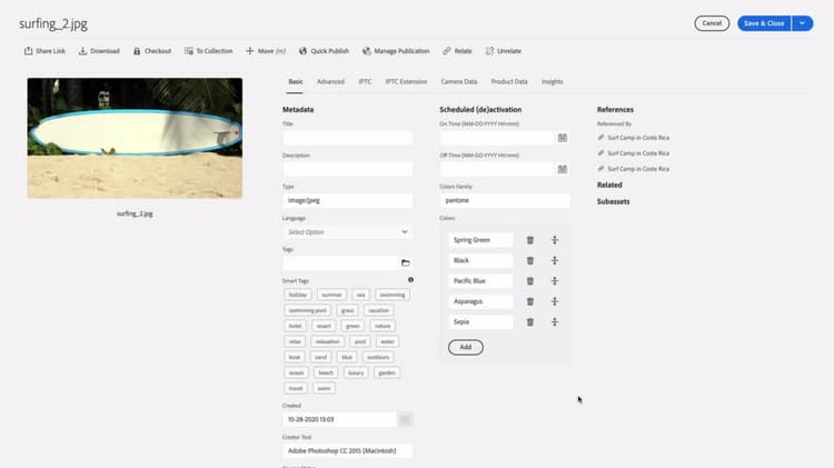 將色彩中繼資料寫入資產的中繼資料後,在[dam:Asset]/jcr:content/metadata資源上,此中繼資料會建立索引,以透過搜尋使用這些字詞提高資產探索能力,而且如果在該資產上叫用 DAM中繼資料回寫 工作流程,甚至可以將這些字詞回寫至資產的二進位檔。