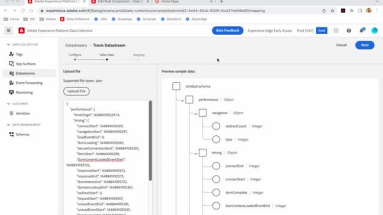 完成資料流的基本設定後選取Save and Add Mapping,並顯示 Select data 步驟。 從這裡,您必須提供範例JSON物件,代表您計畫傳送至Experience Platform的資料結構。