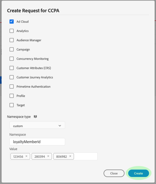 「Create Request」對話方塊開啟,顯示可用選項,用於針對目前選取的法規型別提交隱私權工作請求。