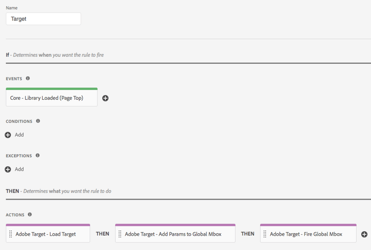 將此動作新增至您的標籤規則,其中在此規則的環境中載入Target是可行的。 如此會將 at.js 程式庫載入頁面中。在大部分實作中,您網站的每個頁面上都應載入 Target。