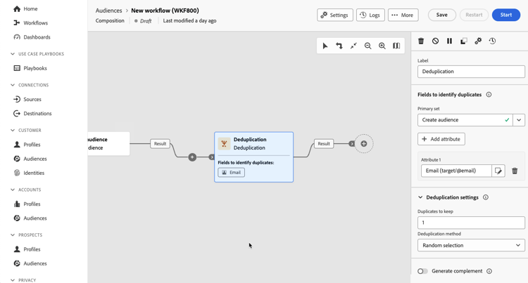 重複資料刪除 活動可讓您刪除入站活動結果中的重複專案,例如收件者清單中的重複設定檔。 重複資料刪除 活動通常用於目標定位活動之後,以及允許使用目標定位資料的活動之前。