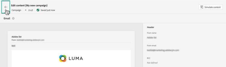 若要瀏覽回到行銷活動建立畫面,請按一下向左箭頭。