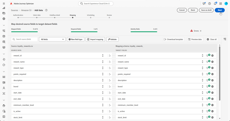 在 對應 視窗中,確認每個來源檔案屬性與目標結構描述中的對應欄位正確對應。 進一步瞭解目標維度。
