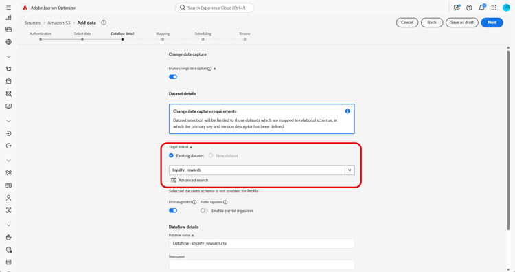 從 資料集詳細資料 頁面,勾選 啟用變更資料擷取,以僅顯示對應到以模型為基礎的結構描述且同時包含主索引鍵和版本描述項的資料集。