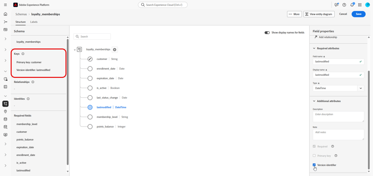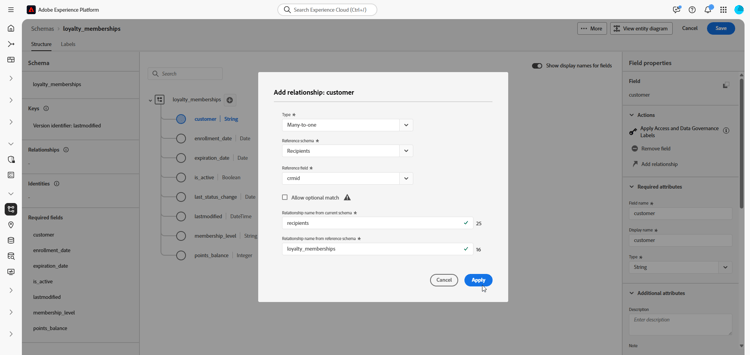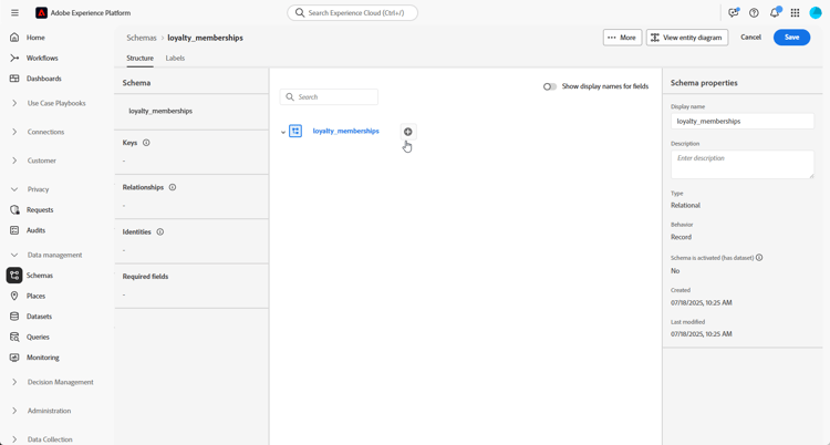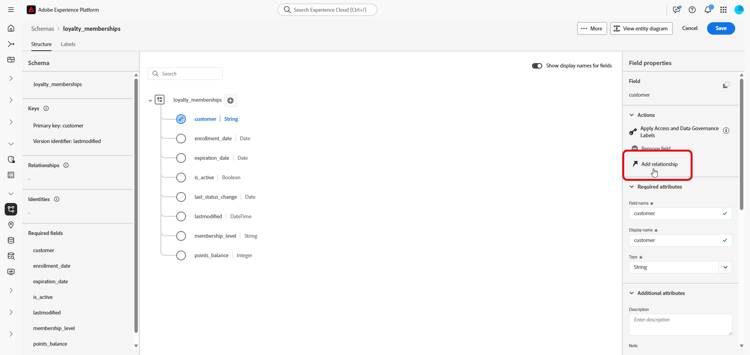 接下來,新增屬性以定義結構描述的結構。 這些欄位代表協調行銷活動中使用的關鍵資料點,例如客戶識別碼、成員資格詳細資料和活動日期。 精確地定義它們可確保可靠的個人化、細分和追蹤。