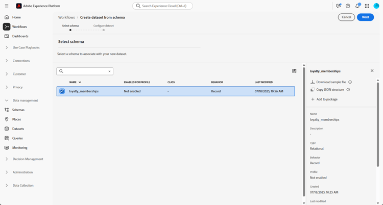 選擇您先前建立的結構描述(在此忠誠度會員資格),然後按一下下一步。