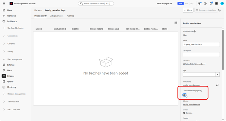 建立資料集後,您需要明確地為協調的行銷活動啟用它。 此步驟會確保您的資料集可用於Adobe Journey Optimizer中的即時協調與個人化。