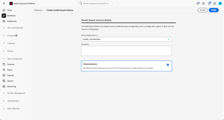首先,在Adobe Experience Platform中手動建立新的模型型結構描述。 此程式可讓您從頭開始定義結構描述結構,包括其名稱和行為。