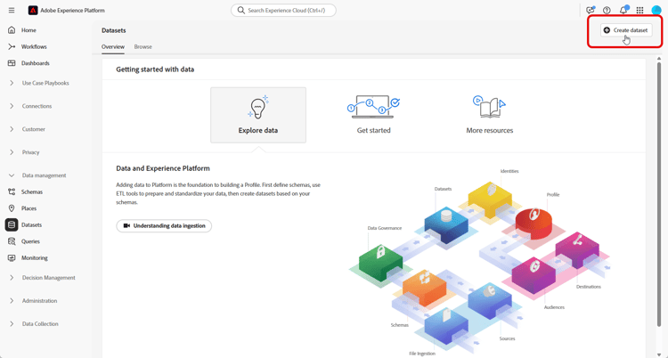 導覽至資料管理 > 資料集功能表,然後按一下建立資料集。