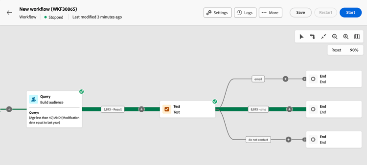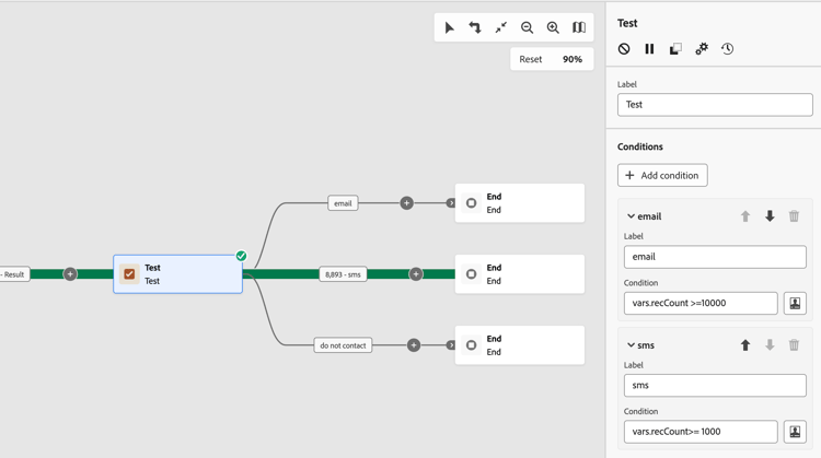為此,已在「電子郵件」和「簡訊」條件中運用 vars.recCount 事件變數,以計算目標設定檔的數量並啟用適當的轉變。