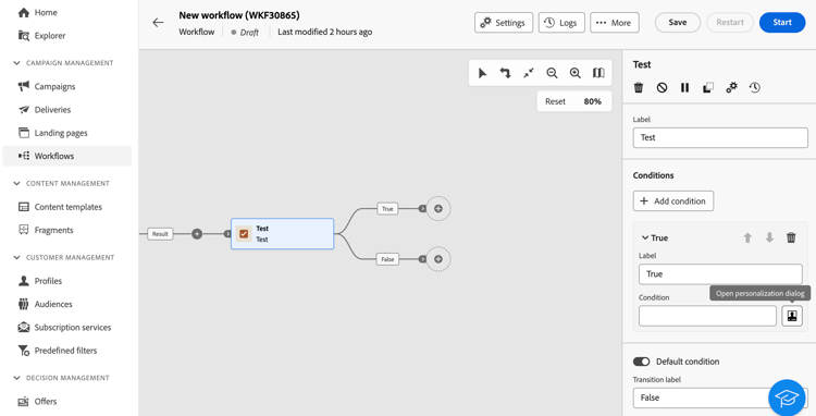 預設情況下,測試活動會呈現簡單的布林值測試。如果符合「真」轉變中定義的條件,則會啟動此轉變。否則,將會啟用預設的「假」轉變。