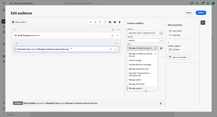 若要鎖定收件者與訊息的互動,請新增連結至 電子郵件追蹤 屬性的其他條件,並搜尋 互動型別 屬性。