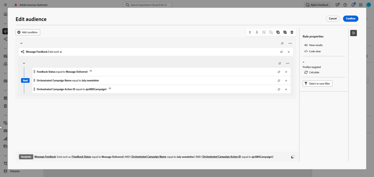 在 規則產生器 中,按一下 新增條件,然後從 屬性選擇器 中選取 訊息回饋。 按一下 確認 建立 訊息回饋存在,例如 條件。
