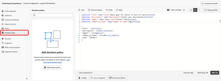使用程式碼型體驗時,您可以使用決策功能。 從左側列選取 決定原則 圖示,然後按一下新增決定原則。 了解更多