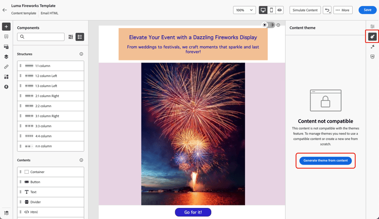 Journey Optimizer可讓您將使用手動樣式建立的範本轉換為與主題相容的內容。 如果您是在將主題引入Journey Optimizer之前建立內容範本,或您正在匯入外部內容,這會特別有用。