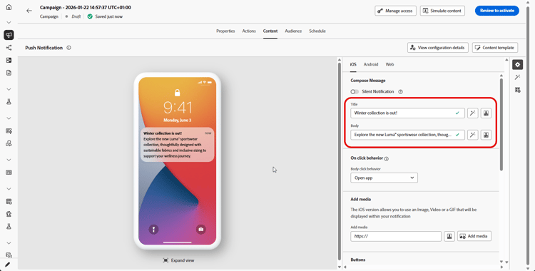 建立推播通知後,您就可以針對iOS和Android平台設計其內容。 此頁面會引導您撰寫訊息、設定按一下行為、新增媒體和按鈕,以及設定進階選項以建立吸引人的推播通知,進而引起觀眾的共鳴。