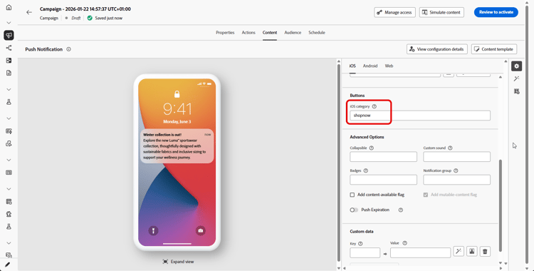 對於iOS,會指定通知類別識別碼。 必須在iOS應用程式中預先設定通知類別,以便定義要顯示的按鈕和要採取的動作。 如需詳細資訊,請參閱Apple檔案。