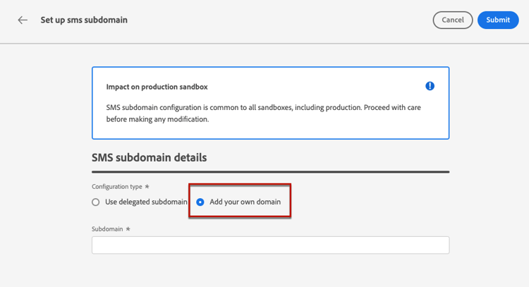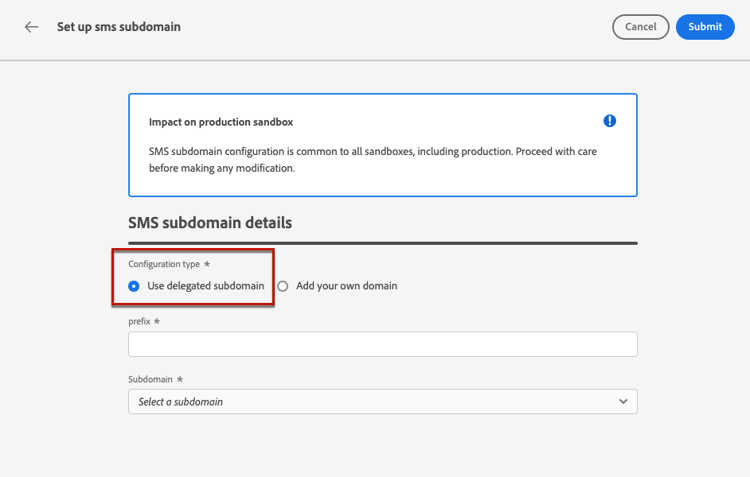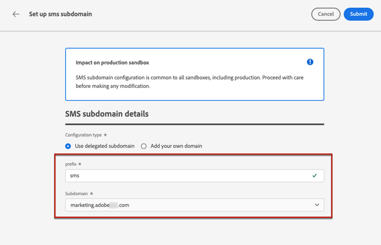 - 在有業務影響的情況下,請聯絡您的Adobe代表,他們可能會協助移除/取消委派SMS子網域。 了解更多