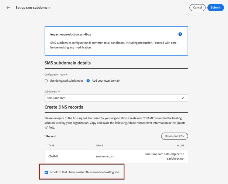 note caution CAUTION 如果您選取使用CNAME方法委派給Adobe的網域,您必須在您的代管平台上建立DNS記錄。 若要產生DNS記錄,此程式與您設定新的SMS子網域時的程式相同。 在本節中瞭解如何操作。 -