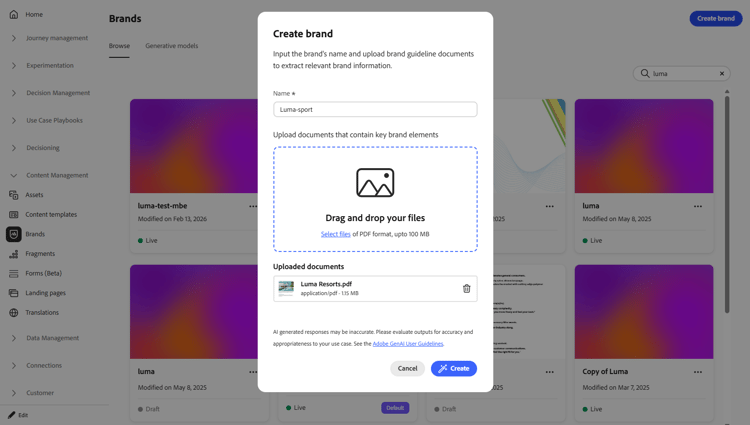 在Journey Optimizer中,您現在可以選擇手動輸入及組織您的品牌詳細資料,或上傳品牌指引檔案以進行自動資訊擷取。
