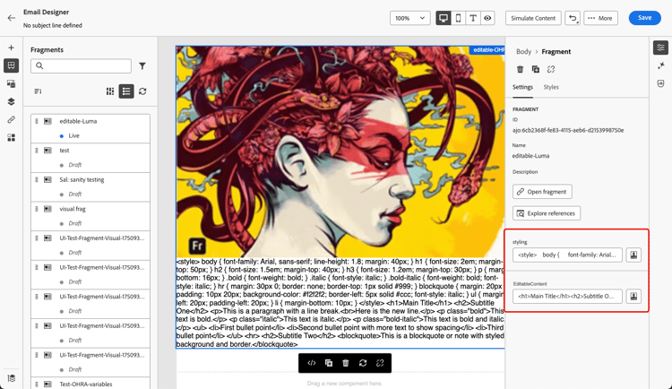 將片段新增到電子郵件後,使用者將能夠自訂片段中設定的所有可編輯欄位。 瞭解如何自訂視覺片段中的可編輯欄位