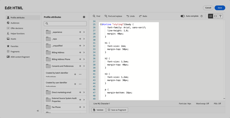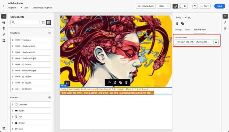 對於HTML元件,變數會顯示在電子郵件Designer的可編輯欄位清單中。 瞭解如何自訂視覺片段中的可編輯欄位