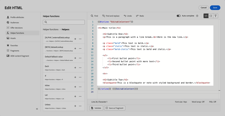 RTF文字(例如分行符號、粗體、斜體等)可以使用HTML元件新增到可編輯的片段中。 若要執行此操作,請遵循下列步驟。