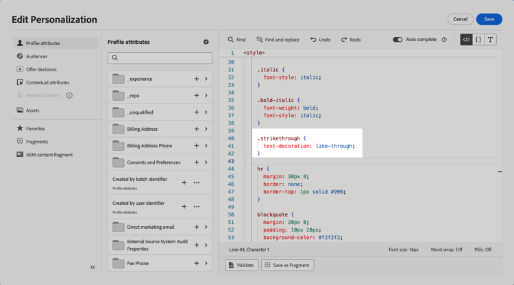 在開啟的個人化編輯器中,新增或移除可編輯欄位的元素,視需要更新樣式和/或內容。