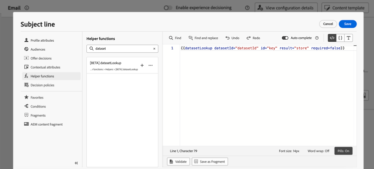 note note NOTE 為此欄位輸入的值可以是欄位識別碼( profile.packages.packageSKU)、在歷程事件中傳遞的欄位(context.journey.events.event_ID.productSKU)或靜態值(sku007653)。 無論如何,系統都會使用值,並在資料集中查詢,以檢查它是否符合索引鍵。如果索引鍵使用常值字串值,請將文字放在引號中。 例如: {{datasetLookup datasetId="datasetId" id="SKU1234" result="store" required=false}}。 如果使用屬性值做為動態索引鍵,請移除引號。 例如:{{datasetLookup datasetId="datasetId" id=category.product.SKU result="SKU" required=false}} -