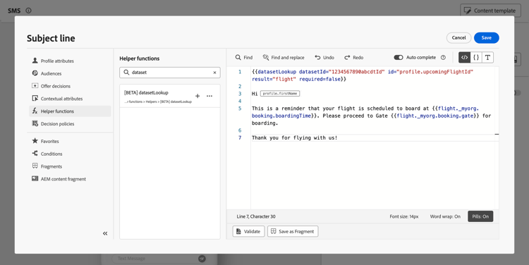code language-none {{datasetLookup datasetId="1234567890abcdtId" id=profile.upcomingFlightId result="flight"}}- 我們正在處理其ID為「1234567890abcdtId」的資料集,
