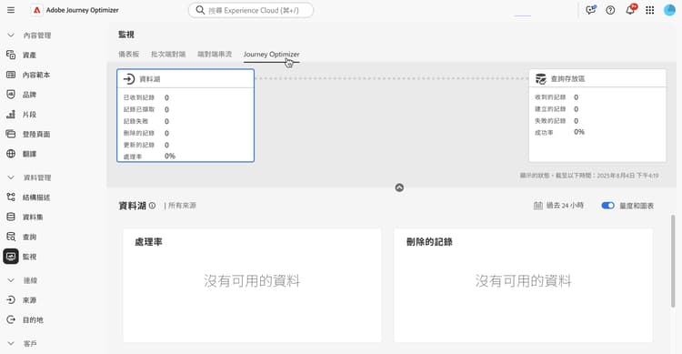 資料集啟用查閱後,您可以前往 監視 功能表並選取 Journey Optimizer 索引標籤,來檢閱擷取至查閱服務的狀態。