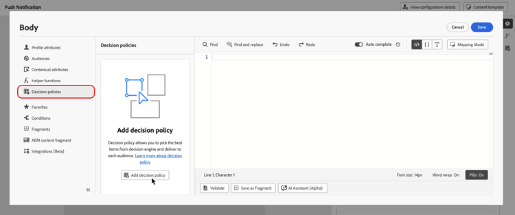 對於推播通知,您可以使用 個人化編輯器 或屬性窗格中可用的 決策 選單來新增決定原則。