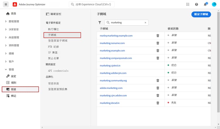 委派子網域:若要在 Journey Optimizer 中使用任何新子網域,第一步是將其委派。 了解更多