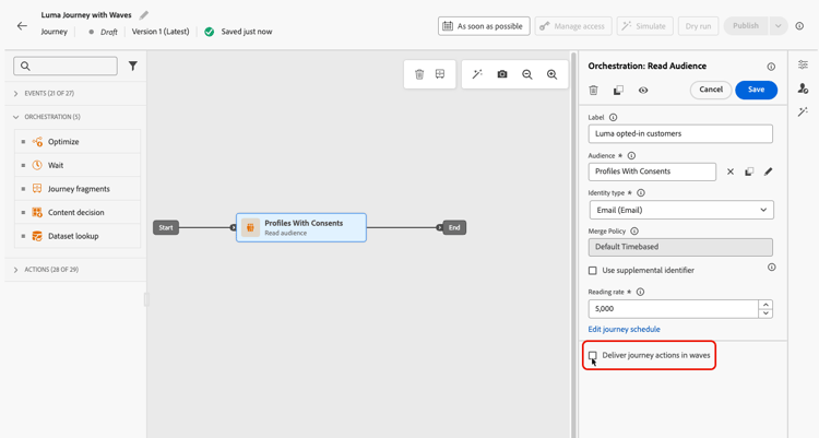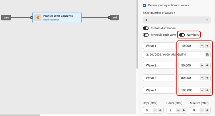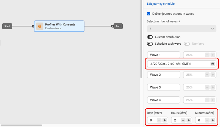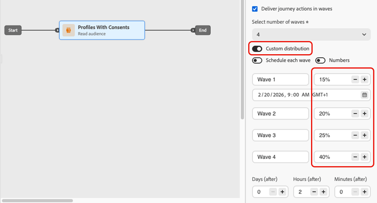 您可以在一段時間內以批次(波段)傳送歷程中的傳出訊息,而非一次傳送所有訊息。 Wave傳送有助於平衡負載、避免壓倒性的下游系統(例如呼叫中心或登陸頁面),並支援傳遞能力與傳送者信譽,尤其是對於高流量讀取對象歷程。
