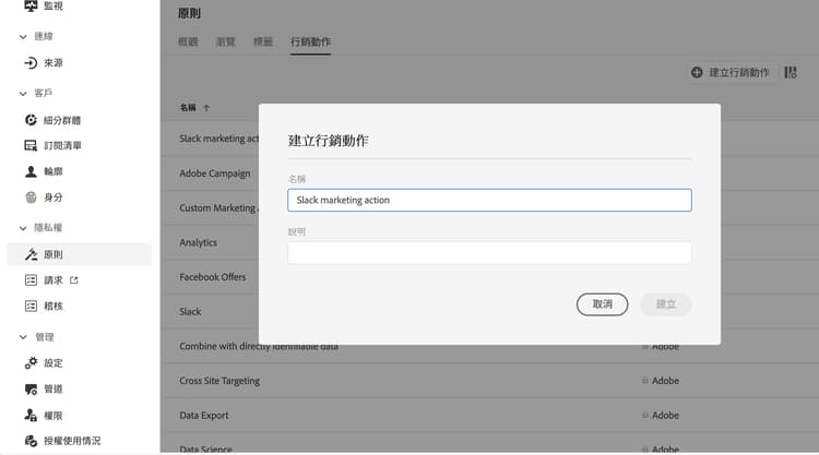 建立治理原則之後,您必須在 Journey Optimizer 管道設定中套用相關的行銷動作。要執行此操作,請依照下列步驟執行: