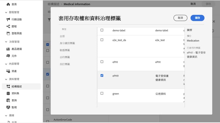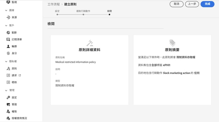 定義標籤與行銷動作後,您可以建立連結這兩個元素的資料治理原則。例如,您可以設定將「ePHI」標籤與「電子郵件目標定位」行銷動作建立關聯的原則,確保標記為「ePHI」的欄位不會用於個人化電子郵件訊息。了解如何建立資料治理原則