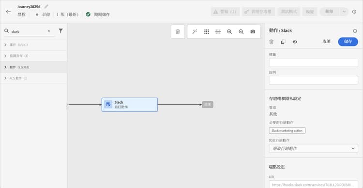 當您要在歷程中以 Slack 行銷動作使用您的 Slack 自訂動作時,會運用到相關政策。