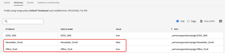 true,觸發針對對應設定檔屬性(false針對選擇加入,針對選擇退出)儲存的同意事件。例如,使用者同意接收推播優惠,但不想接收電子郵件電子報。 對應的設定檔會更新如下: