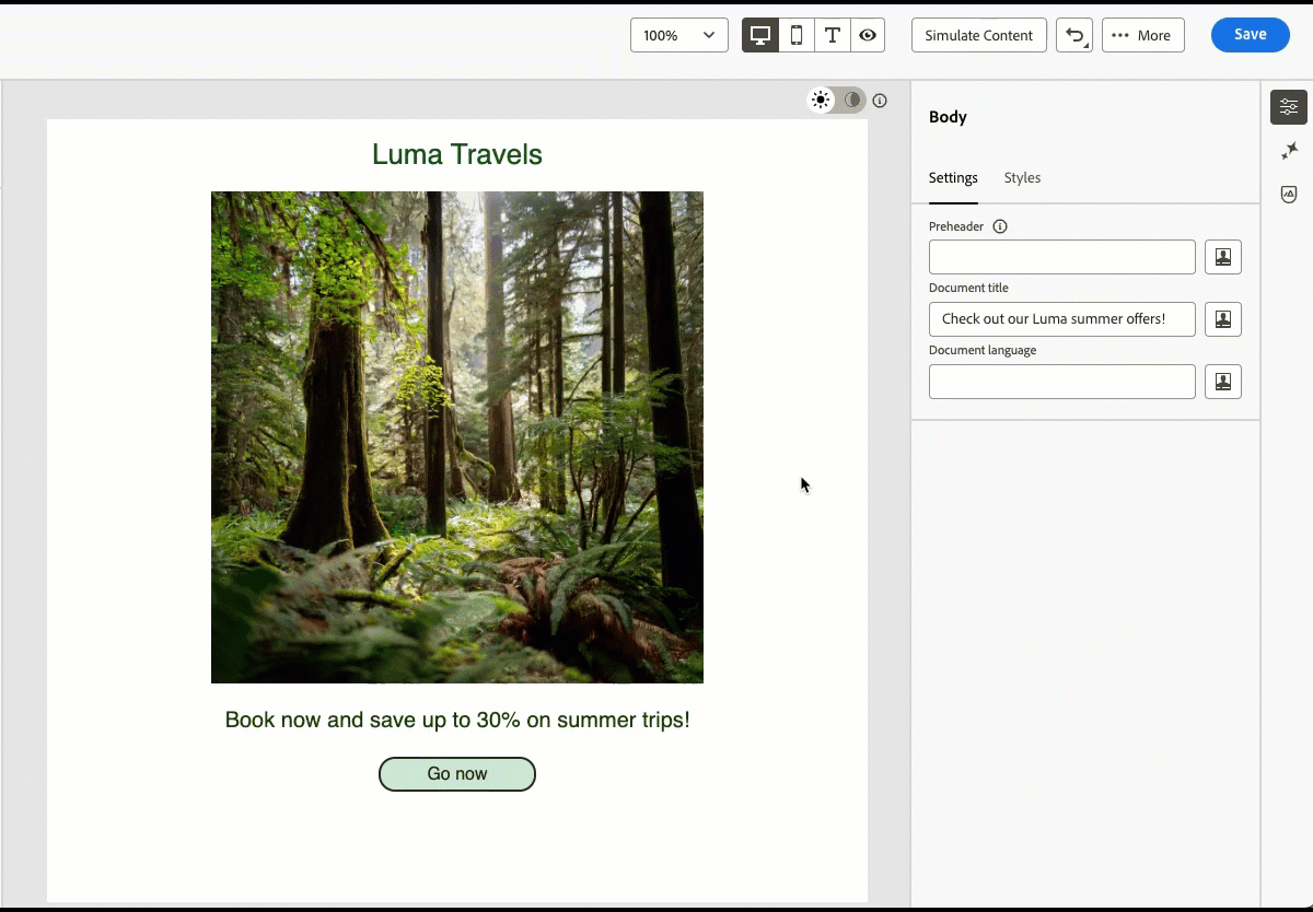 Journey Optimizer 電子郵件設計工具現在提供切換到深色模式視圖的功能,您可以在此處額外定義特定的自訂設定,該設定將僅對在深色模式下讀取其電子郵件的收件者顯示。