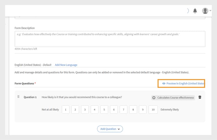 建立多種語言意見回饋表單中問題的翻譯。 不過,您只能新增或移除預設語言的問題(例如英文)。 對於其他語言,您只能翻譯最初以預設語言新增的問題。 無法直接在翻譯版本中新增或移除問題。