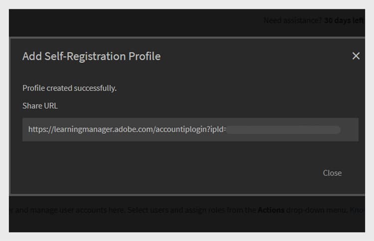 Adobe Learning Manager會建立使用者設定檔並產生自助註冊URL,此URL可與使用者共用以完成其註冊。